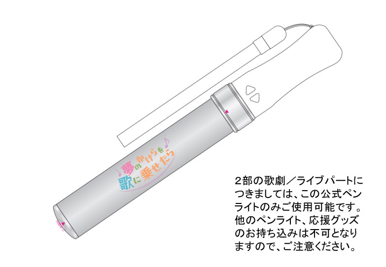 2部の歌劇/ライブパートにつきましては、会場で販売している公式ペンライトのみご使用可能となります。